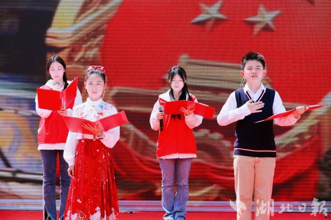 研學(xué)結(jié)束后,學(xué)生們走上了2026長(zhǎng)江書市·武漢童書展首義廣場(chǎng)站的主舞臺(tái)。大學(xué)生與中小學(xué)生聯(lián)袂領(lǐng)誦、合誦《青春中國(guó)》《點(diǎn)贊中國(guó)》《可愛的中國(guó)》,用青春之聲禮贊祖國(guó)。情景劇《最后的家書》與跨年齡組的“紅色配音秀”等節(jié)目,讓紅色經(jīng)典在新時(shí)代語(yǔ)境下煥發(fā)出新活力。